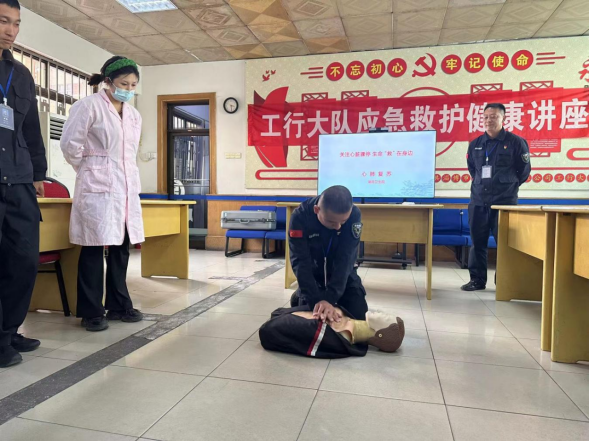 為進(jìn)一步提高基層員工面對(duì)突發(fā)疾病的應(yīng)急處置能力,近日,金融護(hù)衛(wèi)中心工行大隊(duì)特邀湖田中心醫(yī)院醫(yī)生,在大隊(duì)駐地開(kāi)展應(yīng)急救護(hù)健康講座。 講座現(xiàn)場(chǎng),醫(yī)生認(rèn)真細(xì)致地講解了心肺復(fù)蘇的基本流程和步驟,并對(duì)徒手心肺復(fù)蘇操作要領(lǐng)進(jìn)行了重點(diǎn)說(shuō)明。隨后現(xiàn)場(chǎng)演示了胸外心臟按壓、清理口腔異物、開(kāi)放氣道、人工呼吸,并對(duì)心肺復(fù)蘇按壓深度、按壓頻率等重點(diǎn)環(huán)節(jié)的操作要領(lǐng)和流程逐一進(jìn)行講解和示范。隊(duì)員們積極參與,現(xiàn)場(chǎng)體驗(yàn)徒手心肺復(fù)蘇操作,確保此次活動(dòng)取得實(shí)效。 工行大隊(duì)將持續(xù)深化關(guān)心關(guān)愛(ài)基層職工工作,不斷提升職工應(yīng)對(duì)突發(fā)緊急事件的自救和處置能力,增強(qiáng)職工的獲得感、幸福感。